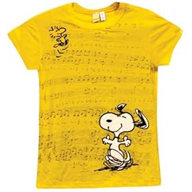 Celebrate the joy of music as Snoopy and Woodstock dance among the notes on this standard cotton short sleeve ladies t-shirt. Great for any lover of music and the Peanuts.