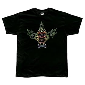 From the Simpsons comes this black cotton t-shirt featuring a wild and colorful print of Krusty The Clown in pinstripe artwork.