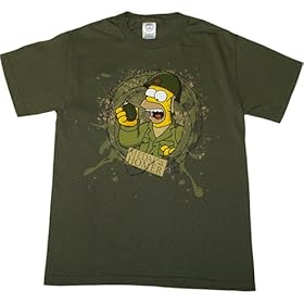 Making fun of World War II videogames, the newest Simpsons game includes a "Medal of Homer" level, and recreates those sappy fallen war heroes games. Green t-shirt features Homer Simpson from "Medal of Homer" with barbed wire and a hand grenade. Standard mens size tee. Shoulder-to-shoulder taped, sleeve and bottom hem are double-needled. 100% cotton. Officially licensed.